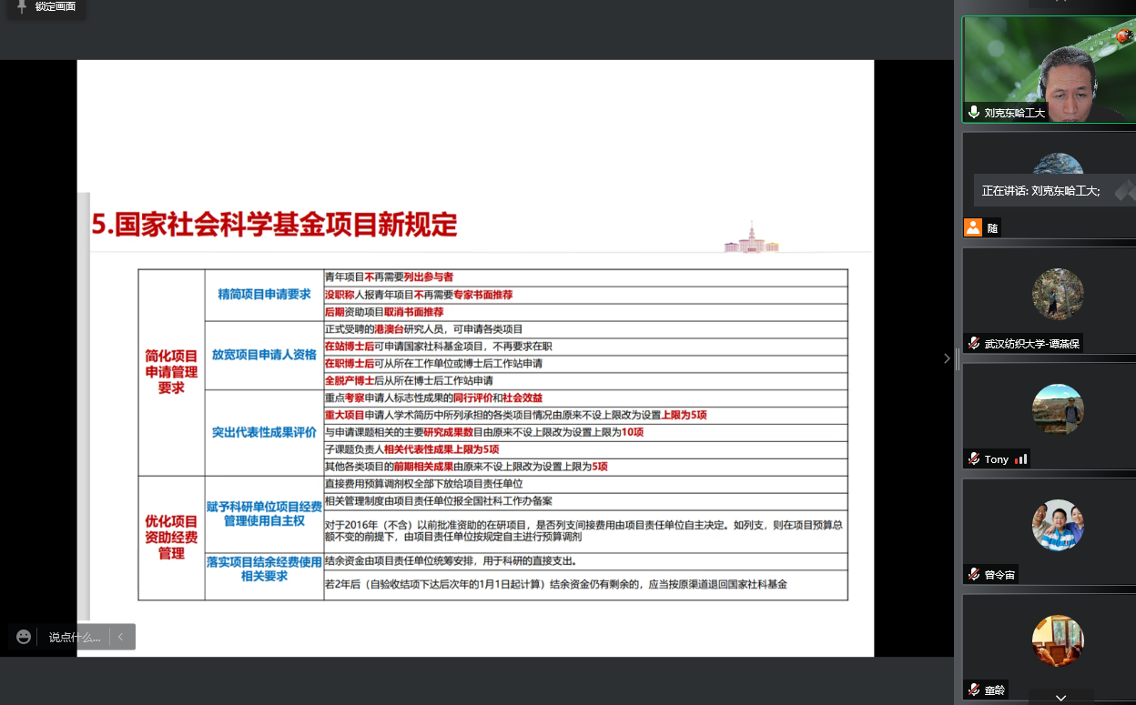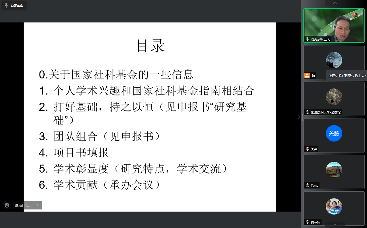 刘克东教授分几个方面系统地向与会教师介绍了国家社科基金项目的相关信息,包括我国哲学社会科学项目资助体系的构成、资助具体项目的简要介绍、申报的评审程序、项目历年资助情况和国家关于项目申报的新增规定,让老师们对国家社科基金项目的整体情况和最新变化有了明确把握。他指出,项目的确立要将个人的学术兴趣和国家社科基金指南进行有机结合;项目申报过程中切忌心浮气躁,应当夯实基础、持之以恒,以坚韧的精神执着地进行研究,以论文写作和成果发表带动项目申报,以前期基础取得学术界的认可。同时,还要积极参加学术会议和学术活动,保持学术交流、紧跟学术领域前沿动态,并为学术圈做出自己的贡献。只有自己的前期基础扎实了,在学术圈内有一定的研究特点和学术彰显度,申报才能获得评审专家的认可,增加成功率。刘克东教授结合多年申报国家社科基金项目的经历,真诚而无私地分享了自己在申报过程中的得失和经验,还以他撰写的申报书给与会老师们展示了成功的申报范例。他鼓励与会教师们积极申报国家社科基金项目,在这个过程中整理自己的治学思路,聚焦和回应国家的需求,争取在学术研究中取得更大的成就。
