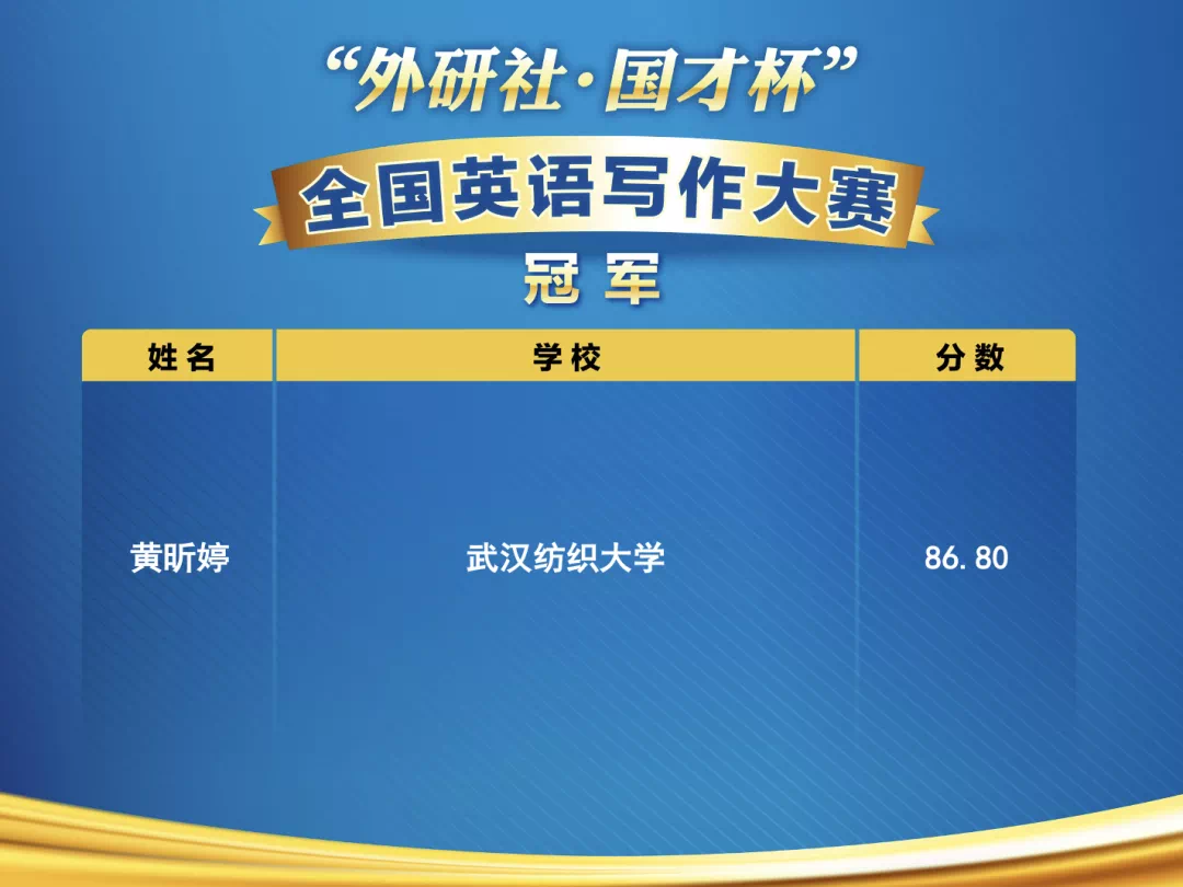 12月10日, 2021“外研社·国才杯”大学生英语挑战赛全国总决赛完美落幕,其演讲、写作、阅读三大项各产生总冠军1名,亚军及季军若干名。武汉纺织大学国产乱婬AV片免费学生黄昕婷以86.8的高分稳居全国第一,荣获写作大赛全国总冠军。