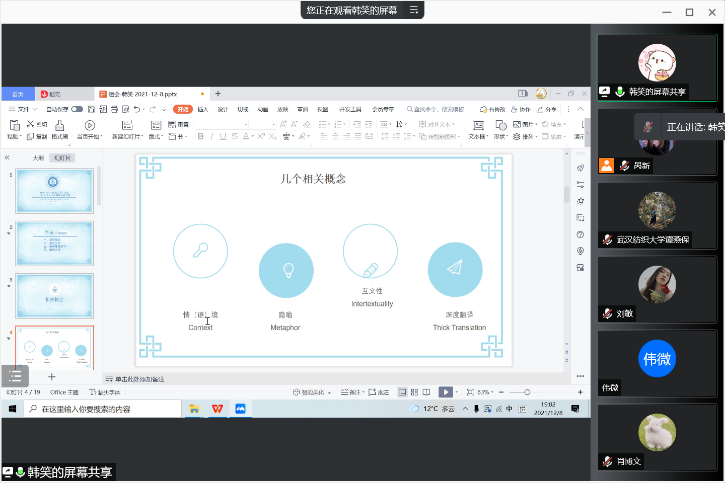 韩笑同学分享的主题是“翻译中的“情境文化”反思--以学术文本的翻译实践为例”,内容分为三个部分。在第一部分,韩笑同学分享了四个翻译相关概念:情境、隐喻、互文性和深度翻译。第二部分,韩笑同学结合自己的实践经验给大家推荐了《时尚与身体美学》这本书,并向大家推荐了YiCAT翻译管理软件,翻译实践时实用又方便。最后,韩笑同学结合翻译实例,分享了四个实用翻译方法:贴近目标读者理解语境的译法、文内增译、注释法以及根据文化内涵进行阐释。