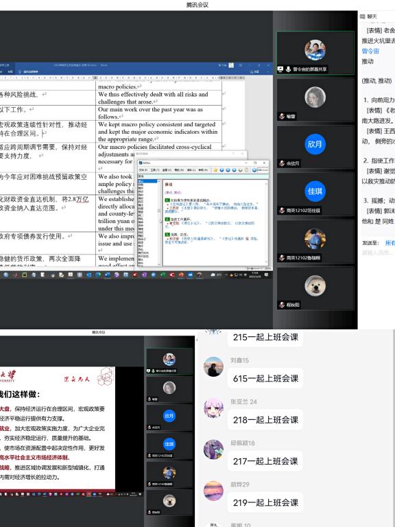余果同学对两会提案中有关反家暴、父亲陪休产假、拐卖儿童立法等问题发表了自己的看法,她认为我们应该更加注重女性自身权益以及对妇女儿童等弱势群体的保护。程虎同学讨论了疫情防控下如何提高学习效果、提高课堂学习专注力的方法。孟子欣同学希望疫情能够得到有效控制,能早日恢复面对面的线下教学,希望能够走出校园,体验美丽武汉、魅力江城。车西昂同学提出两会话题12年义务教育的提案,结合自己的实践经历,感恩自己获得的教育机会,也希望能够有更多的孩子得到上高中的机会。