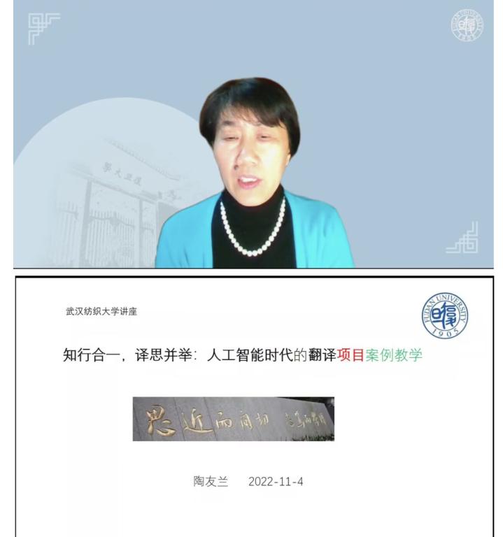 11月4日晚7:30,国产乱婬AV片免费邀请复旦大学翻译系主任、MTI教育中心主任、博士生导师陶友兰教授在云端为全体教师做了一场精彩的学术讲座,题目为:知行合一,译思并举:人工智能时代的翻译项目案例教学。讲座由院长谭燕保教授主持。