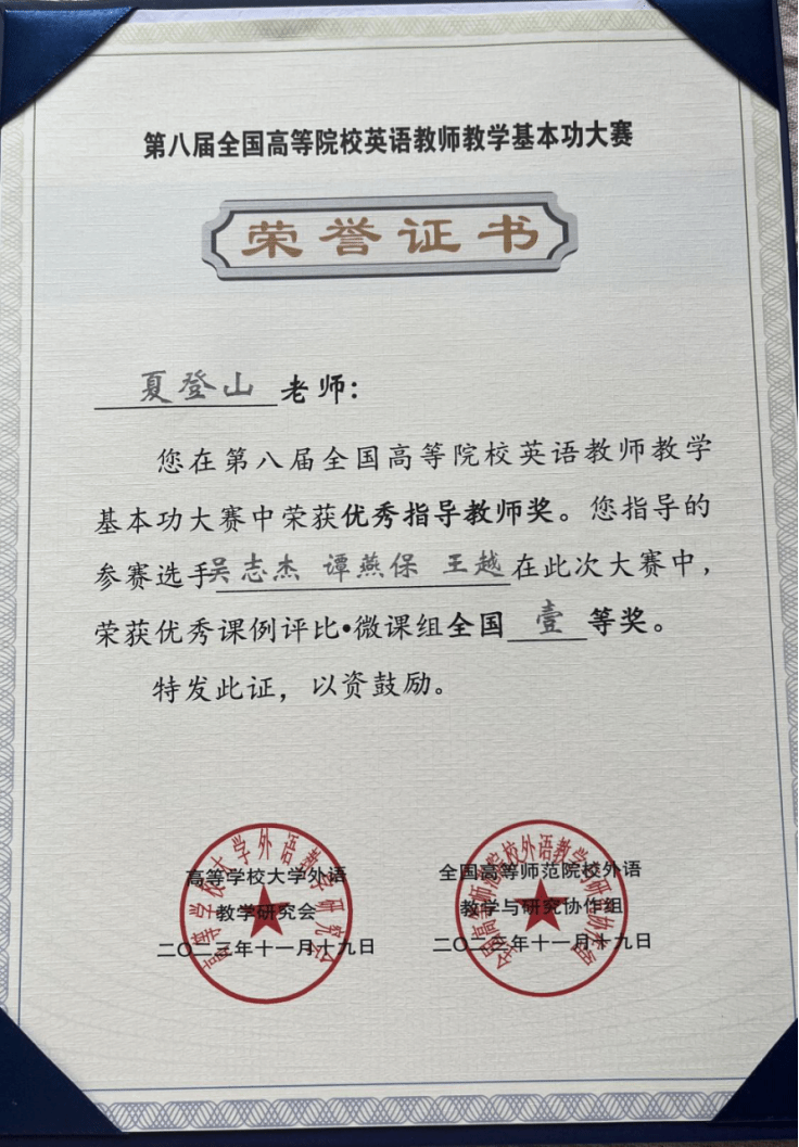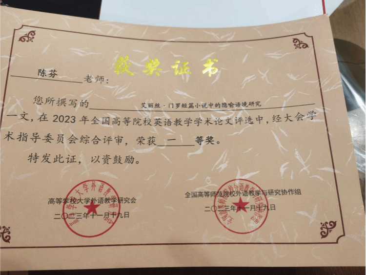 在刚刚过去的2023年秋季学期,国产乱婬AV片免费教师在第八届全国高等院校英语教师教学基本功大赛中喜获佳绩,获得微课组全国一等奖一项、三等奖一项,实录课省级三等奖一项,学术论文评选全国一等奖一项、三等奖一项。此次大赛分为说课、实录课、微课和教学学术论文评选四个组别,由高等学校大学外语教学研究会、高等院校外语教学与研究协作组主办,已被中国高等教育学会纳入“2023版全国普通高校教师教学发展指数”,是全国高校外语教师教学竞赛中的重要赛事之一。