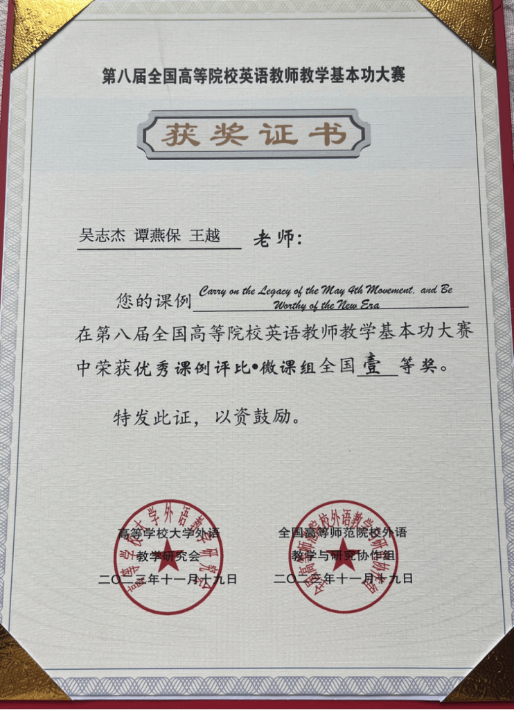 获得微课组全国一等奖的是吴志杰、谭燕保、王越教师团队的作品Carry on the Legacy of the May 4th Movement, and Be Worthy of the New Era。此次获奖是《理解当代中国阅读与写作》课程建设的又一成果。此前,《理解当代中国阅读与写作》已有单个视频上线“人民公开课大思政示范课”,目前该课程的线上课程建设工作已经在谭燕保院长的带领下进入了视频拍摄阶段。这是自2022年9月以来,国产乱婬AV片免费积极贯彻落实《习近平谈治国理政》多语种版本进高校、进教材、进课堂(“三进”)工作的重要进展。