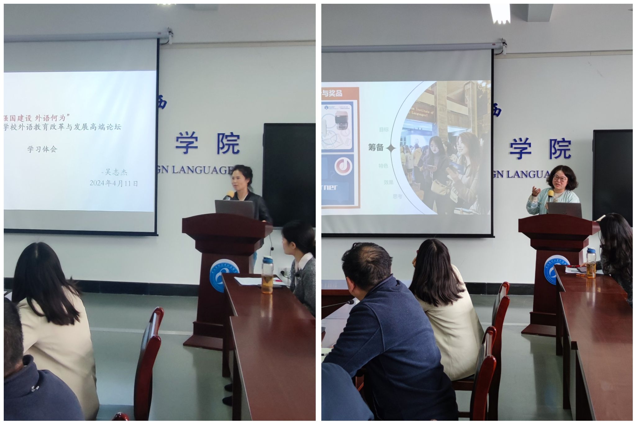 商务英语教研室主任吴志杰分享了她参加以“强国建设 外语何为”为主题的第八届全国高等学校外语教育改革与发展高端论坛的学习体会。本次论坛由北京外国语大学、教育部高等学校外国语言文学类专业教学指导委员会、教育部高等学校大学外语教学指导委员会和中国高等教育学会外语教学研究分会联合主办。高端论坛上,教育部高等教育司副司长武世兴强调了外语教育与“四新”有机融合的必要性、外语教育改革数字化的必然趋势,推动外语教育与人工智能双向互促的紧迫性。外语教学指导委员会的专家何莲珍、王文斌、李芒等强调了构建中国自主的外语人才培养体系和自主的应用语言学知识体系;拥抱人工智能、正确使用数字技术辅助教学的必要性。吴志杰结合专家们的发言,认为学院的专业建设要从教材变革、社会实践、数字化转型等角度进行发展,构建自主的外语人才培养体系。
