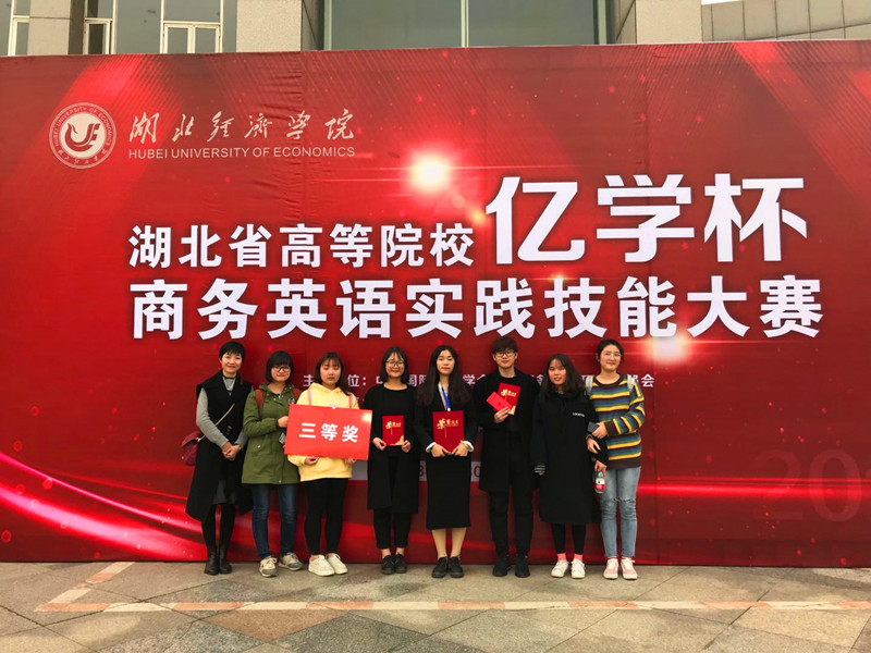 2018年12月,首届“湖北省高等院校亿学杯商务英语实践技能大赛”在湖北经济学院举行,该赛事由国国际贸易学会国际商务英语研究委员会主办、湖北经济学院承办,华中农业大学、中南财经政法大学、湖北经济学院等20所高校代表队参赛。我校商务英语专业的17级本科生马子璇、范敏、凡浩铭参赛并获得三等奖。