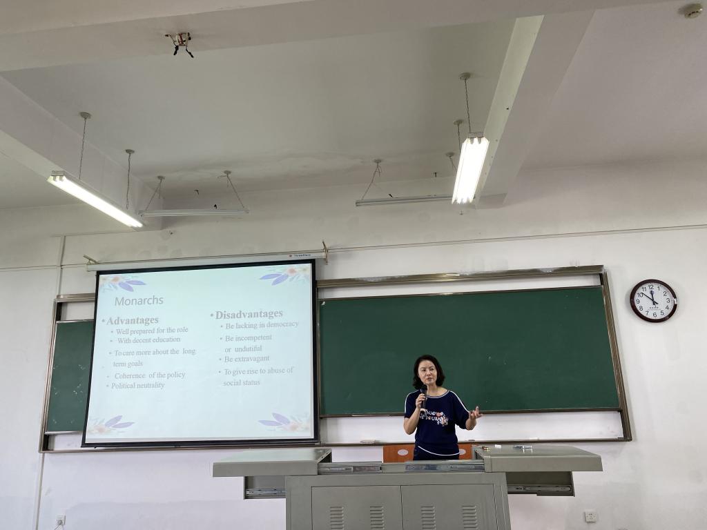 王愿老师以“英语语言拓展---英语国家概况”教程的第三章(英国政府)为例,先后介绍了内容选择、教学方法运用、教学目标设定及教学步骤,详细介绍了英国宪法以及君主立宪制部分的教学内容和教学重难点,并引导学生更深层次地思考英国宪制的优缺点。