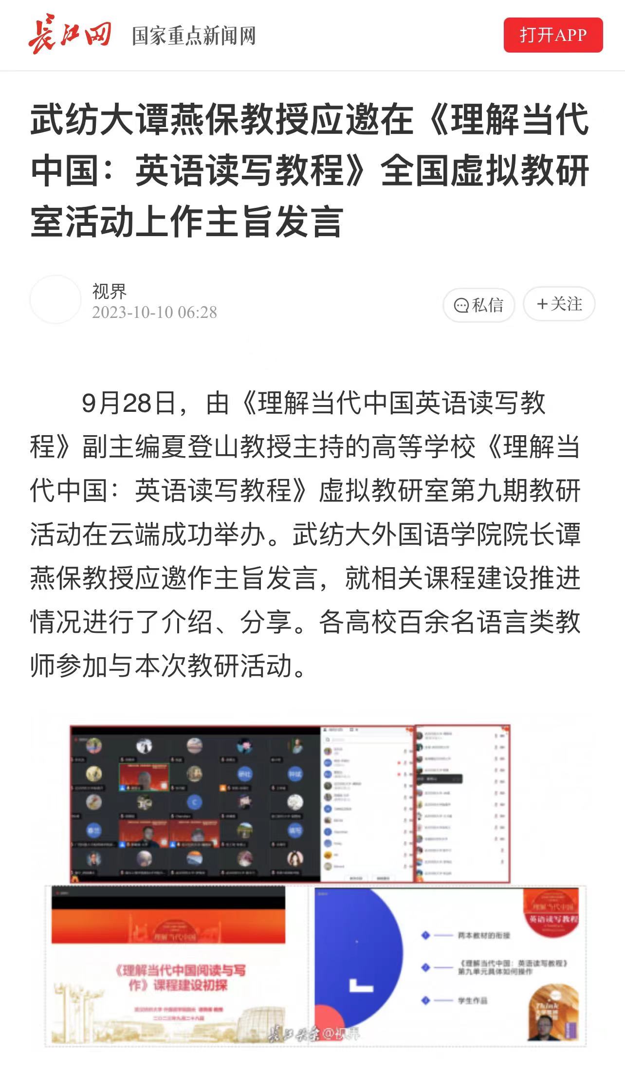 9月28日,由《理解当代中国英语读写教程》副主编夏登山教授主持的高等学校《理解当代中国:英语读写教程》虚拟教研室第九期教研活动在云端成功举办。武纺大国产乱婬AV片免费院长谭燕保教授应邀作主旨发言,就相关课程建设推进情况进行了介绍、分享。各高校百余名语言类教师参加与本次教研活动。