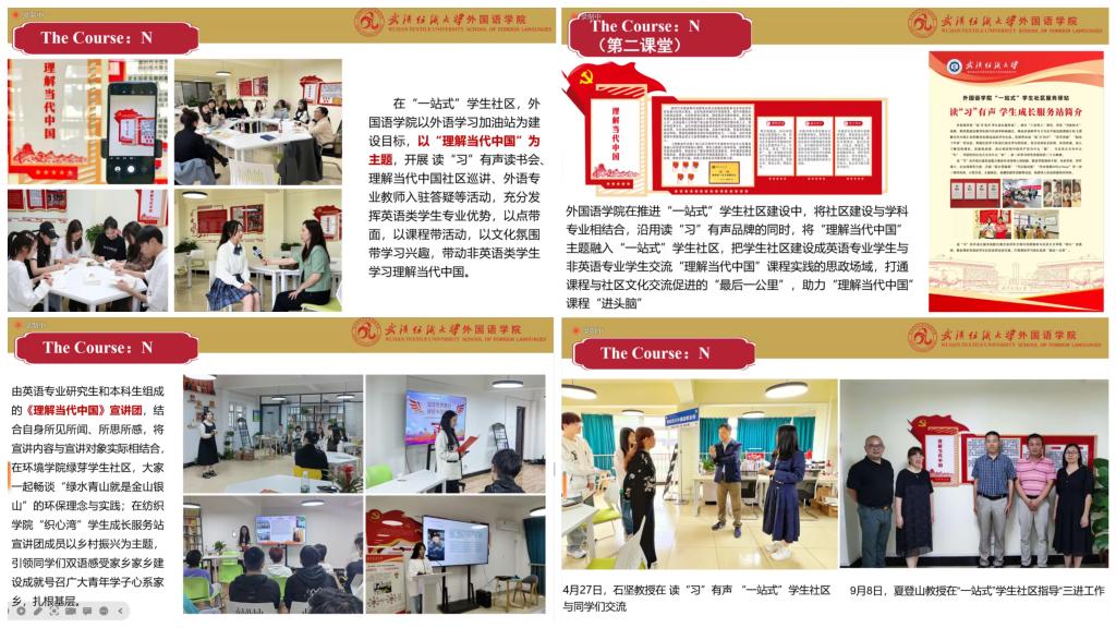 “面对百年未有之大变局,作为外语教师,我们要深刻领悟“大思政课”的时代引领价值,探究善用“大思政课”的器、术、道、势,才能切实培养国家需要的人才,引导学生把爱国情、强国志转化为报国行,自觉融入中华民族伟大复兴的历史征程”,谭燕保教授对该课程在建设过程中所体现出的系统性颇有心得。目前,武汉纺织大学国产乱婬AV片免费为深入推进“三进”工作,宏观层面,以“3+N”模式,将《理解当代中国》系列教程分别嵌入本科生与研究生课程体系;微观层面,以“1+N”模式将课程建设体系化、高阶化,既落实到人才的培养,也强化于教学团队建设,既实践于课内,也拓展到课外,既服务于教,也服务于学。这种模式下的课程建设,充分体现出了课程的思想性与学术性,尤其是教学学术性。夏主编回忆起参观国产乱婬AV片免费“一站式”社区的场景,忍不住赞叹道,“武汉纺织大学的课程建设,其思想性与体系化目前已处于全国领先地位”。国产乱婬AV片免费“一站式”社区的每一张图片、每一寸书桌、每一个足迹、每一篇社会媒体报道,都留下了《理解当代中国》、习近平新时代中国特色社会主义思想的深深印记,贯彻落实了“三全育人”的实践要求;很大程度上解决了专业教育和思政教育“两张皮”的问题。