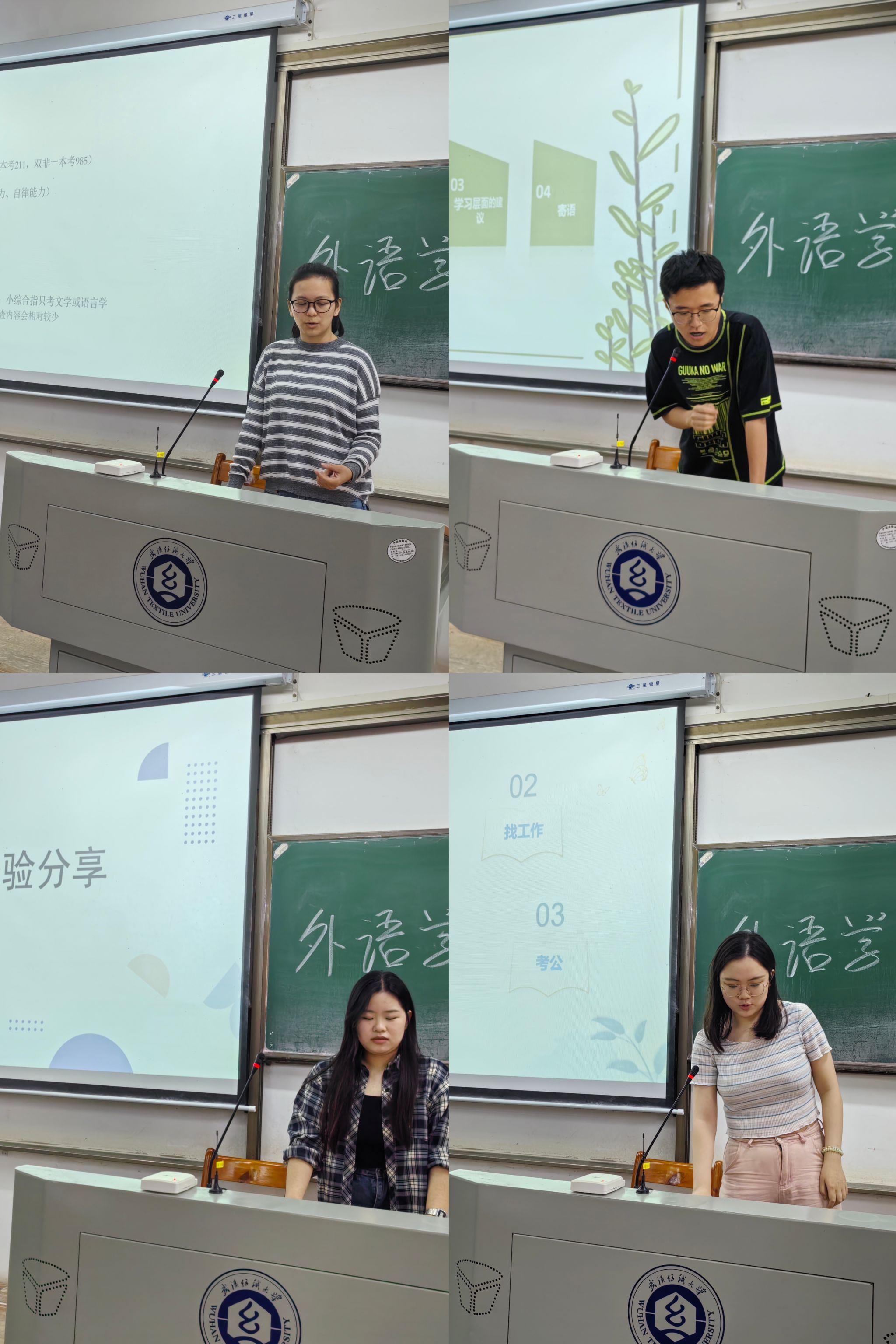 在交流会上,曾玉璇、刘倩、何昊然3名同学就大家关心的考研问题作了详细分析与指导。曾钰璇针对她所考的专业给同学们分享了她的考研学习计划。同时,她也强调了选择目标院校的重要性,建议同学们多跟老师沟通,选择适合自己的院校。刘倩从思想政治理论、翻译硕士英语、英语翻译基础及汉语写作与百科四个方面介绍了英语笔译专业,让大家加深了对该专业学习方向的认知。何昊然建议大家多结交志同道合的朋友,向朋友们学习并且互相督促,在考研的过程中更要做到劳逸结合,该放松的时候就放松,特别是到后期要放平心态。