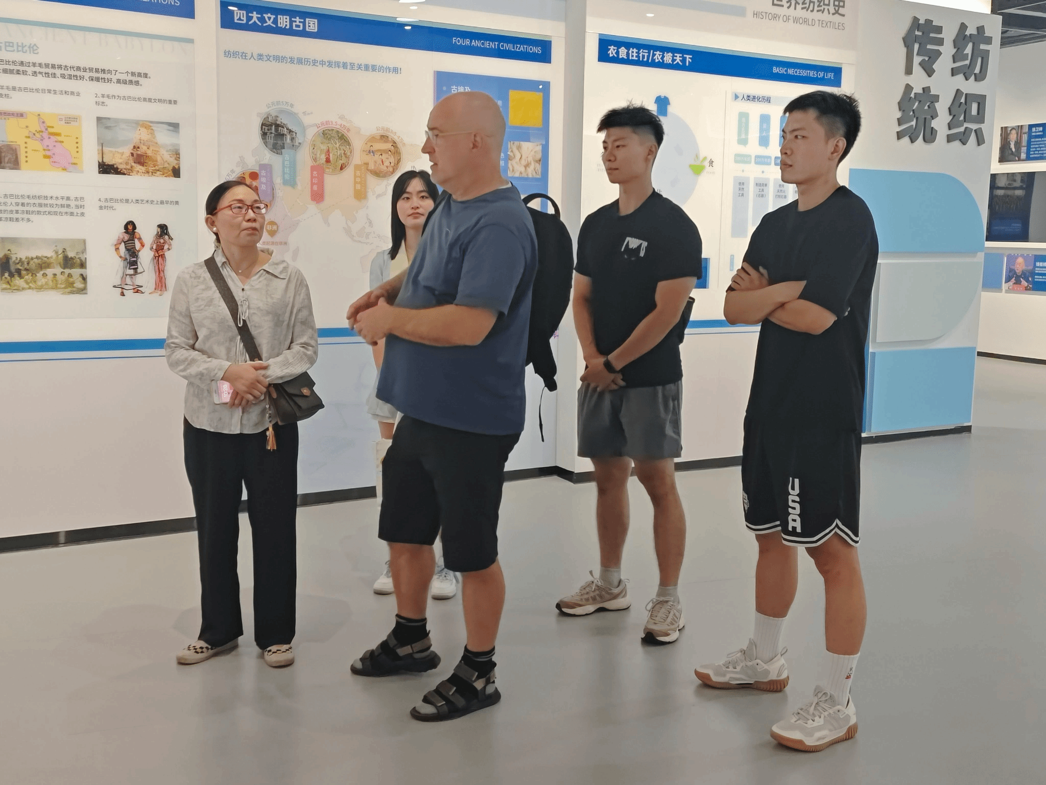 在参观过程中,我院MTI学生凭借扎实的专业功底,担任起现场讲解与翻译工作。他们首先向Sterckx教授系统介绍了中国纺织的历史脉络——从新石器时代的原始纺织工具,到汉唐时期绚丽的丝绸制品,再到宋元明清纺织技艺的精进与传播,生动展现了纺织作为中华文明重要载体的深厚底蕴。随后,学生们结合展馆史料,讲述了武汉纺织大学在纺织领域的发展历程,特别介绍了校党委书记徐卫林院士在纺织材料领域的深耕与突破。同时,学生们也向教授讲述了知名校友李建全的故事。