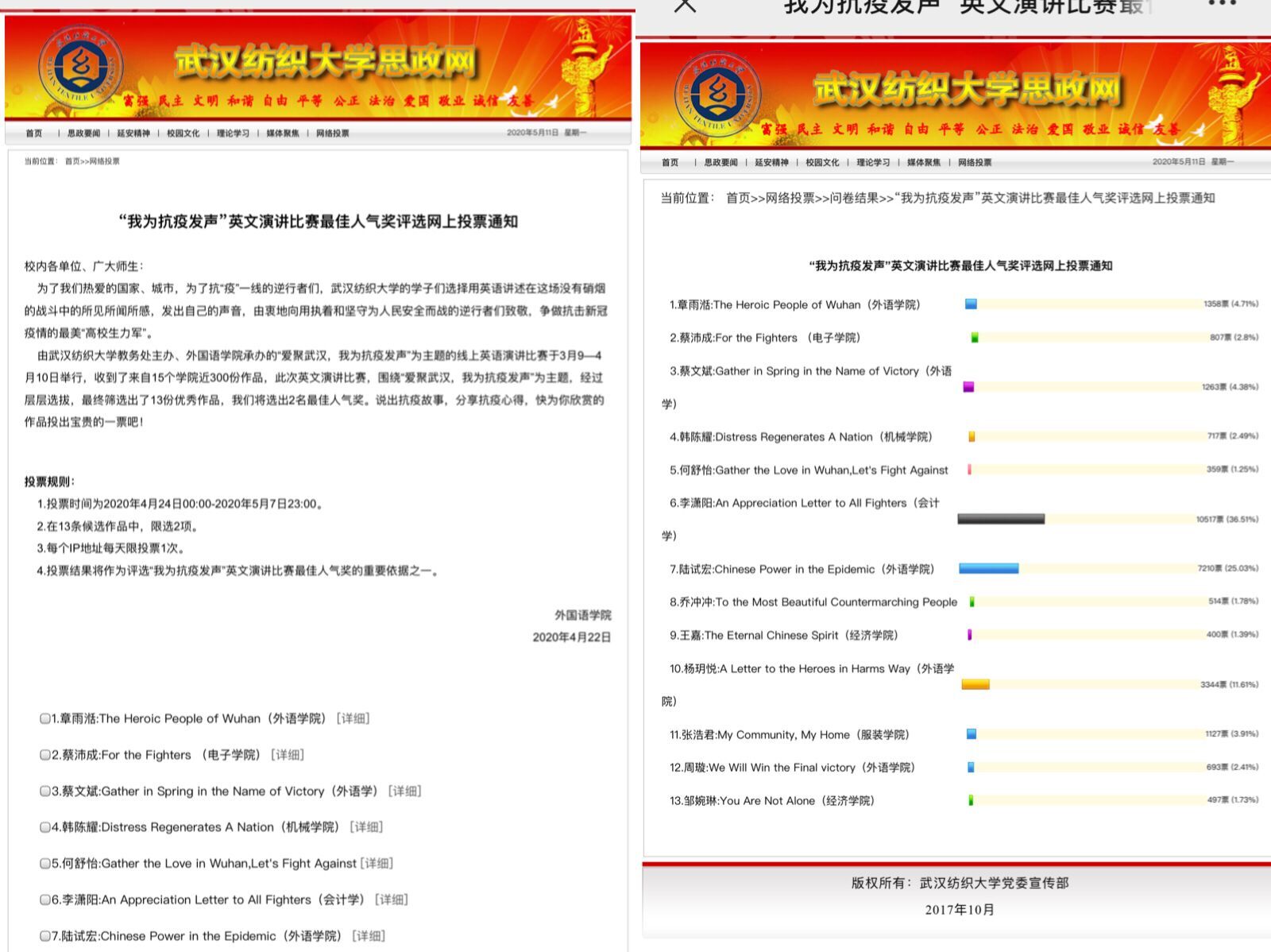 演讲比赛分为专业组和非专业组,经过前期同学们的精心准备和视频录制,收到了来自15个学院近300份作品。在众多的参赛作品中,同学们围绕抗击疫情的主题,歌颂着抗疫英雄们,分享疫情期间的感人事迹,表达对疫情的见解和看法,表明对战胜疫情的决心等。例如,国产乱婬AV片免费蔡文斌的参赛作品“Gather in Spring in the Name of Victory”向奋战抗疫一线的战士们表达了崇敬感恩之情,向千千万万被困家中的人们传递了抗疫必胜的信心。经济学院邹婉琳的演讲“You are Not Alone”则表达了对医护工作者的感谢感激,对中国速度的赞叹。服装学院张浩君,在这场全民战役中,她勇敢的站了出来,加班加点保证爱心物资安全到岗,挨家挨户排查落实,上报情况,为社区居民的正常生活保驾护航。
