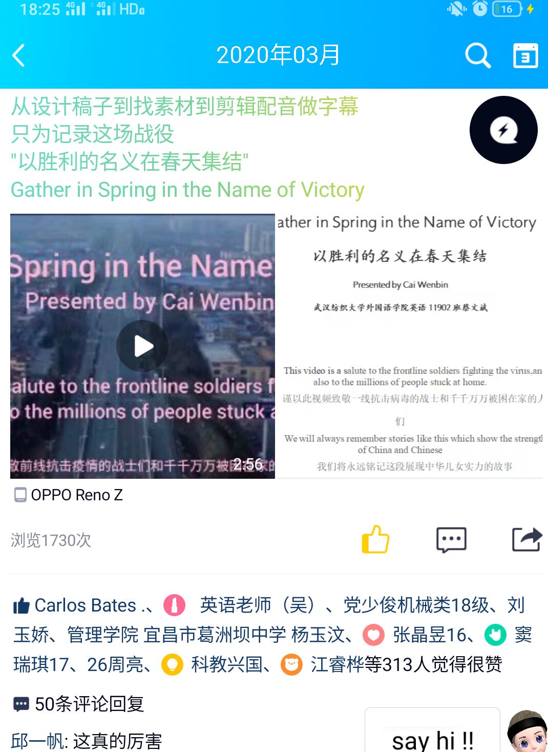 自疫情发生以来,我看到空间里涌现了一些为抗击疫情,歌颂一线医务人员和志愿者的视频,深受感动,我也有了想做一个抗疫视频的想法。但是在完成好网课任务和做视频之间总是犹豫不决。不久看到了国产乱婬AV片免费发布的征集英文演讲视频的通知,我更坚定了自己的选择。3月12日写稿,13,14日找素材,15日剪辑,改稿,16,17日剪辑配音,一周之内“速成”了我的第一个视频“Gather in Spring in the Name of Victory”(以胜利之名在春天集结),视频上传到youtube,微博和QQ空间后收到了海内外网友们的留言支持。在新冠病毒蔓延全球的今天,我想这不仅仅是对中国抗疫的记录,也是对其他各国的鼓励,中国能挺过来,其他国家也能挺过来,就像视频中讲到“Precisely because of these protectors,our victory is close at hand”正是有了这些保护我们的人,胜利即将到来。