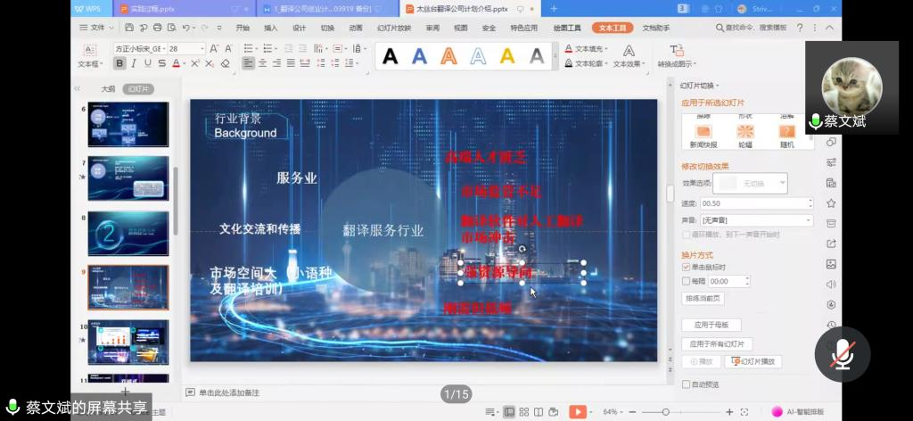 会议的主要流程是首先由各参赛小组分别阐述项目,接着评委随后一一提问并听取小组答辩,最后给出指导意见。学院12个团队通过PPT进行了展示,创业项目涵盖翻译公司、英语培训机构、在线辅导教育、纺织文化遗产的英文数字集成、少数民族文化的传播、独立网络现实教育平台、跨境电商独立站建设等项目。评委们从产品介绍、市场分析、营销策略、团队能力和经营管理、财务分析等方面进行了认真细致的评审。