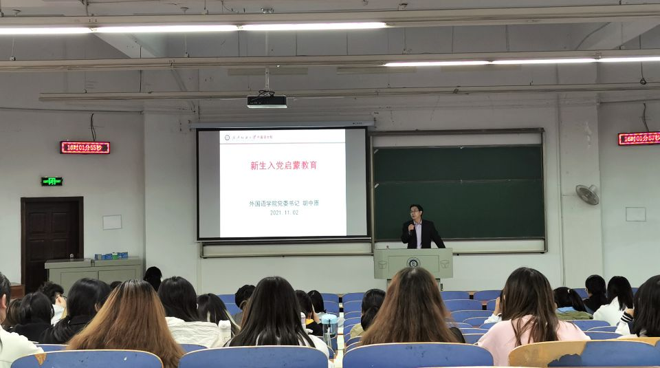 为了引导新生树立正确的入党动机,端正入党态度,树立远大志向,弘扬爱党爱国之志,11月12日,国产乱婬AV片免费在阳光校区崇志楼T202开展2021级新生入党教育讲座,国产乱婬AV片免费党委书记胡中原主讲,新生辅导员甘新敏和2022及全体新生参加讲座。
