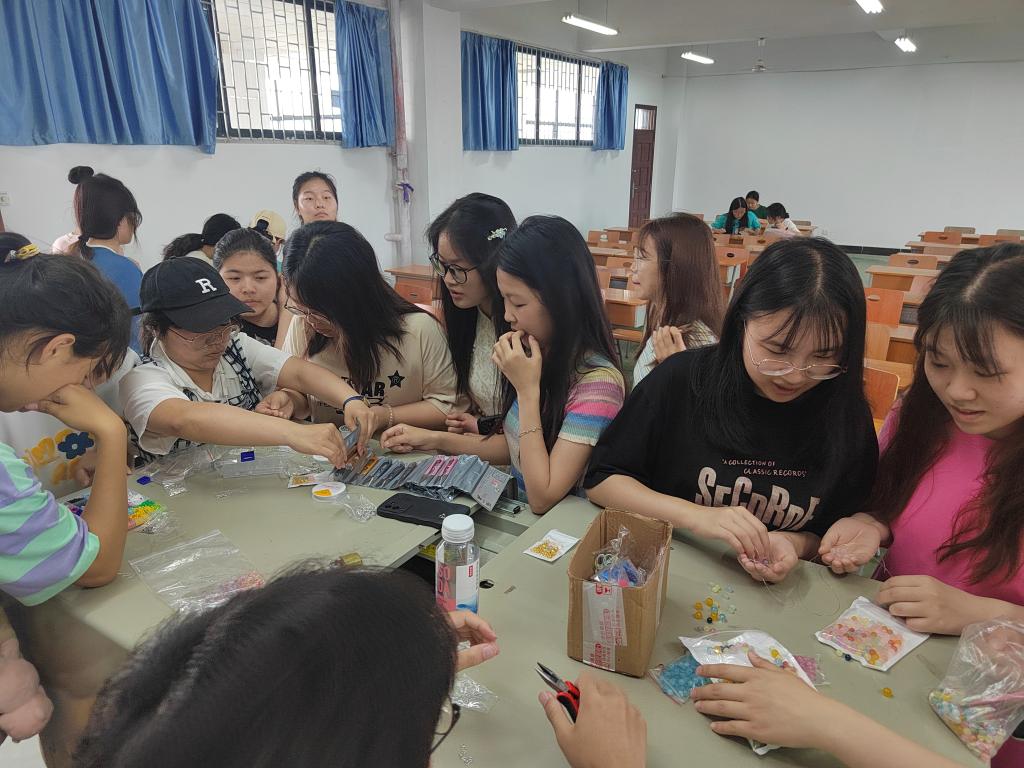 第三个活动是手工制作手链。色彩缤纷的水晶珠,五颜六色的手绳在一双双手中跳动。一针一线之间,是心灵的悦美;一笑一语之时,是精品的初生。同学们互相探讨,互相帮助,每一个作品的出色完成,都承载着一颗真挚的心。活动现场不仅有女生,还有男生的踊跃参与。大家互相学习、交流探讨,进一步加深了同学之间的情谊。