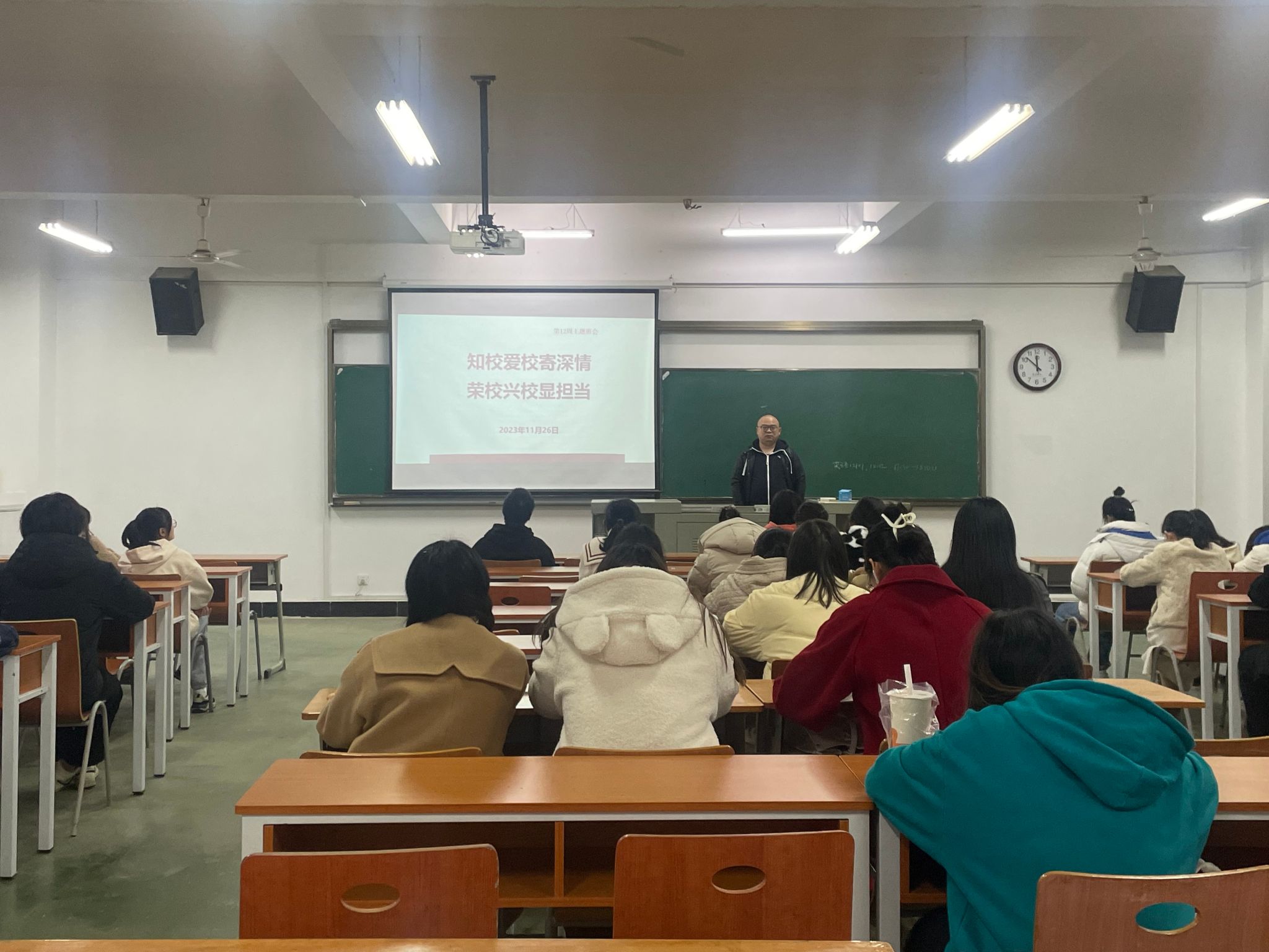 为厚植爱校荣校情怀,激励同学们勤奋学习,11月26日晚,学院全体辅导员、班主任通过线下方式,深入各班级组织进行晚点名,开展“知校爱校寄深情 荣校兴校显担当”主题班会,学院全体本科生参会。