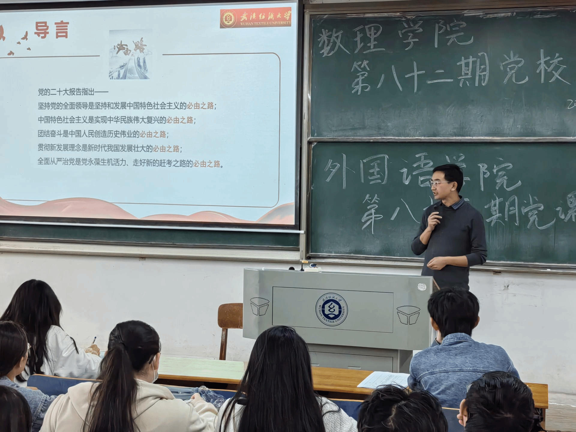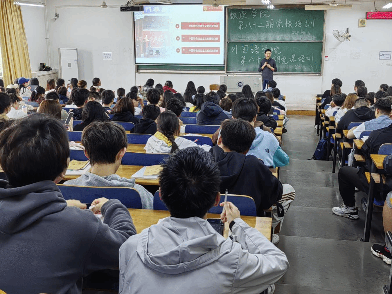 为加强对入党积极分子的培养教育,切实把好党员发展“入口关”,4月11日,国产乱婬AV片免费、数理科学学院在崇真楼联合举办第82期入党积极分子培训班第一讲,马克思主义学院的汪书路老师以“中国特色社会主义的历史根基、理论依据和实践基础”为题授课,数理科学学院和国产乱婬AV片免费入党积极分子参加。